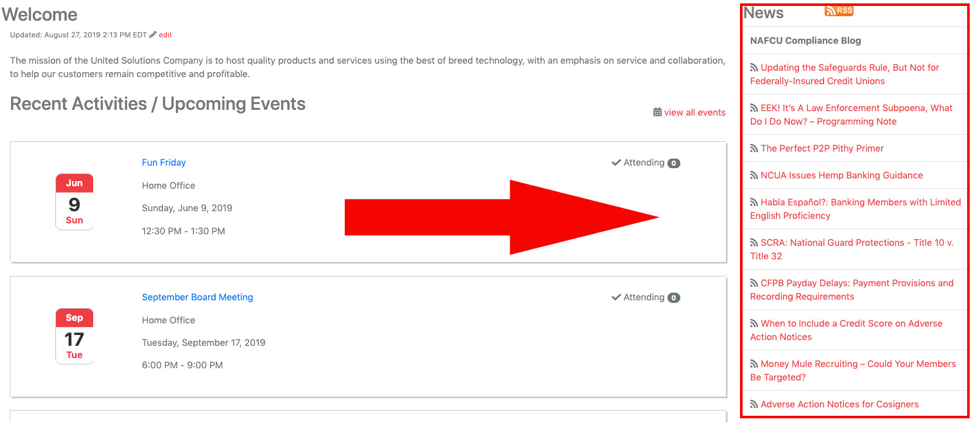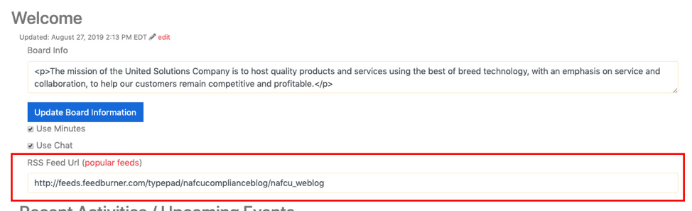 This newest feature is located on the home page on the right-hand side of the screen. Administrators of Board Reports have access to change and update the RSS feed.