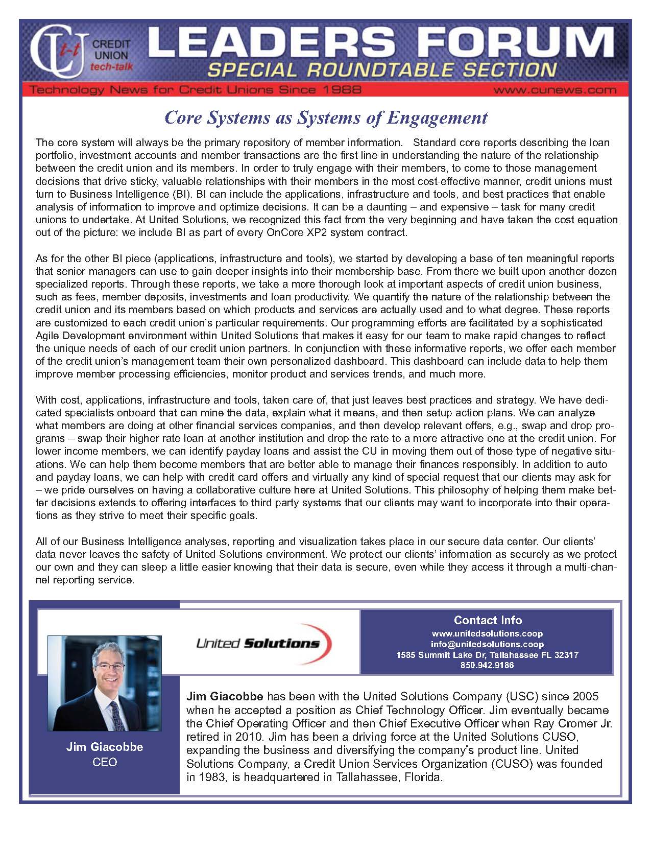 Jim Giacobbe has been with the United Solutions Company since 2005 when he accepted a position as Chief Technology Officer. Jim eventually became the Chief Operating Officer and then Chief Executive Officer when Ray Cromer Jr. retired in 2010. Jim’s commitment to the credit union industry, innovative technologies, and team integrity has made him a respected and successful leader across the credit union service technology industry. Jim explains, “If we treat our customers and our staff with respect, offer best of breed technology, control expenses, and work hard to provide the best service possible we are way ahead of our competition. The formula for success isn’t that hard, but being disciplined and staying on task is the challenge.”