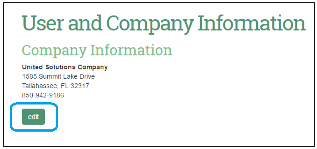 Company information and the company’s logo can be updated by selecting the ‘edit’ button on the ‘Company Information’ section of the ‘Add User and Company Information’ screen.