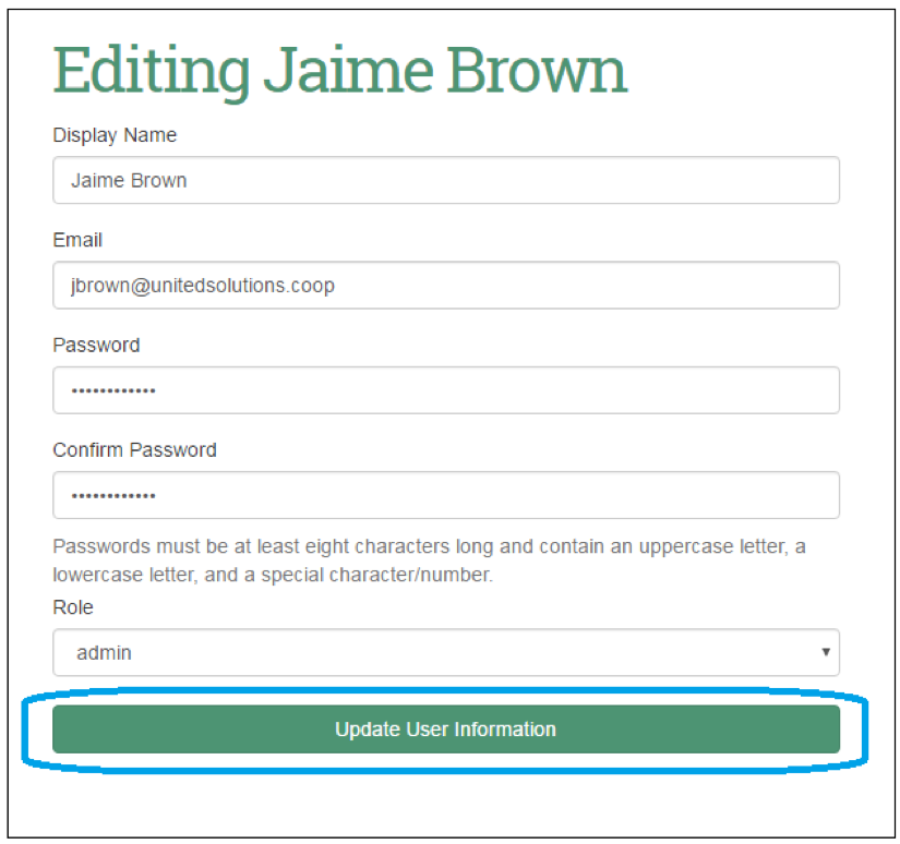The desired new password is entered, and then re-entered for confirmation. To complete the password reset for the intended user, select the ‘Update User Information’ button.