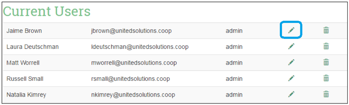 B) Admin-Reset: from the ‘Add User and Company Information’ page, the admin selects the edit (pencil icon) option for the user that requires a password reset.