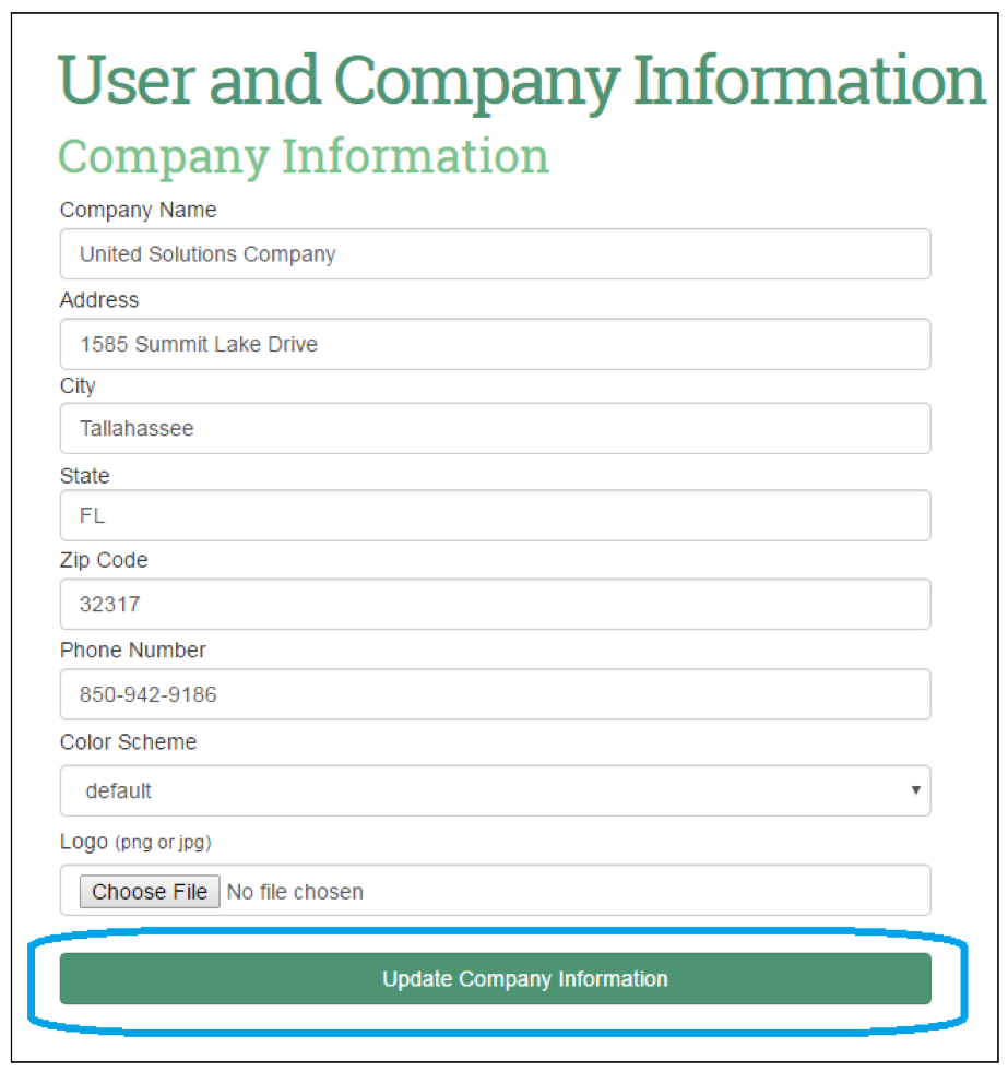 Enter the updated company information into the corresponding fields, as needed. Use the ‘Choose File’ button in the ‘Logo’ field to select the company’s logo (in either .png or .jpg file format). Once updated, select the ‘Update Company Information’ button to save the changes.